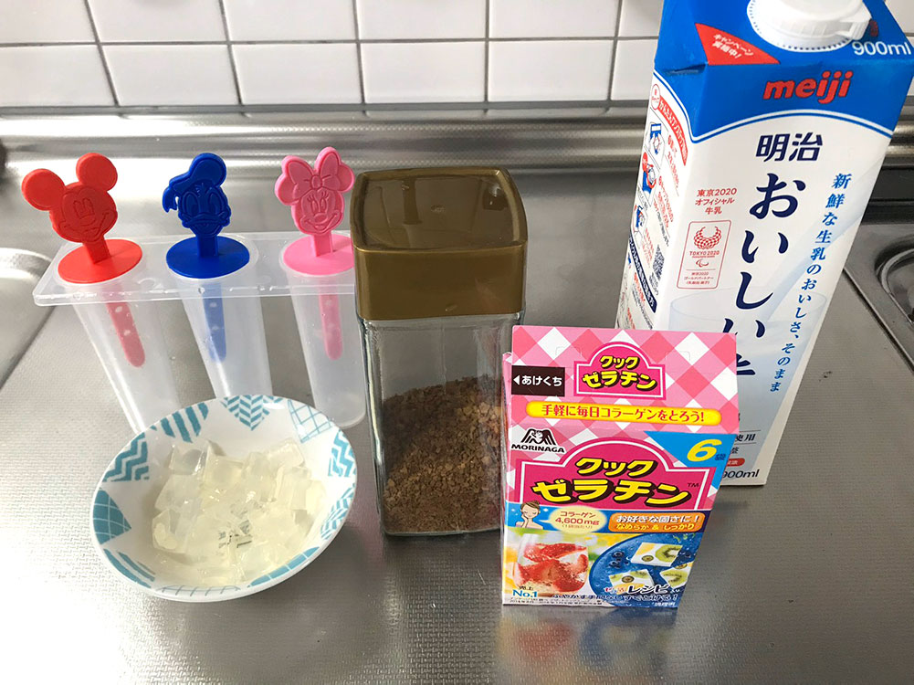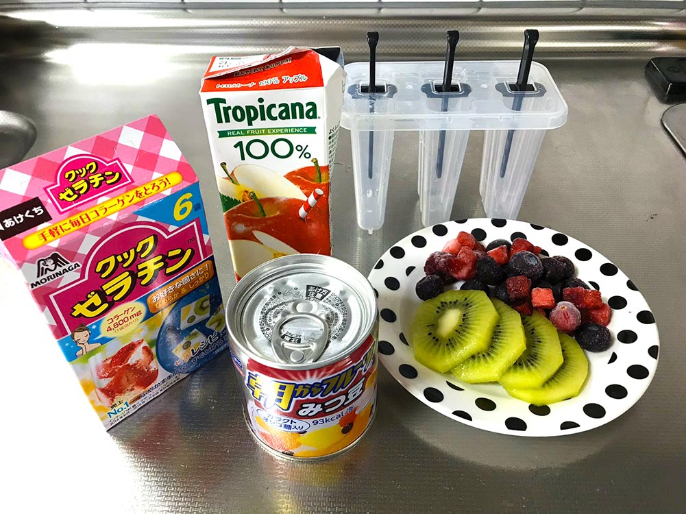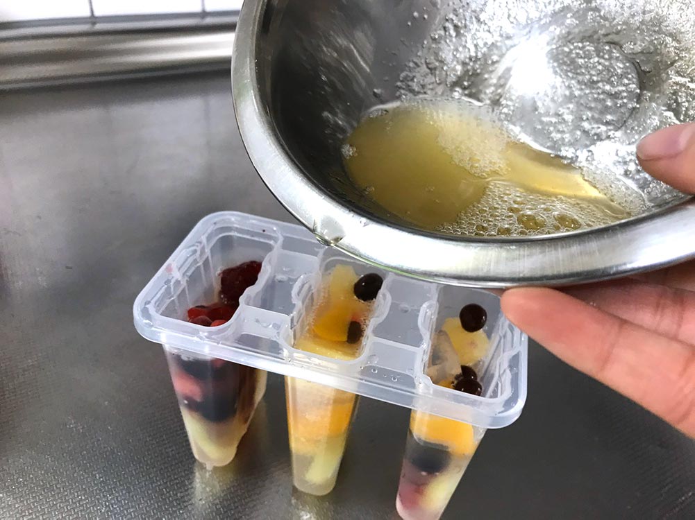 型に切った果物を入れて、ゼラチンを混ぜたジュースや牛乳を流し込みます。