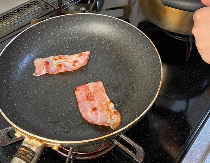 まずはパンとベーコンを焼きます。